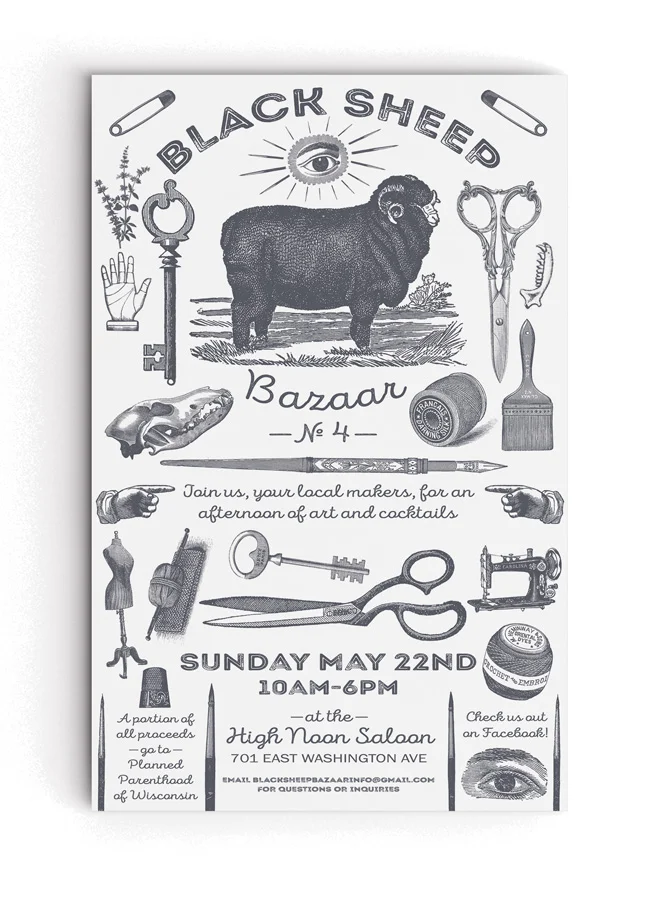 The Black Sheep Bazaar is an amazing event featuring non-traditional artists and crafty types getting together for one day of shopping and cocktails. I had lots of fun designing posters and merch for the most recent bazaars.